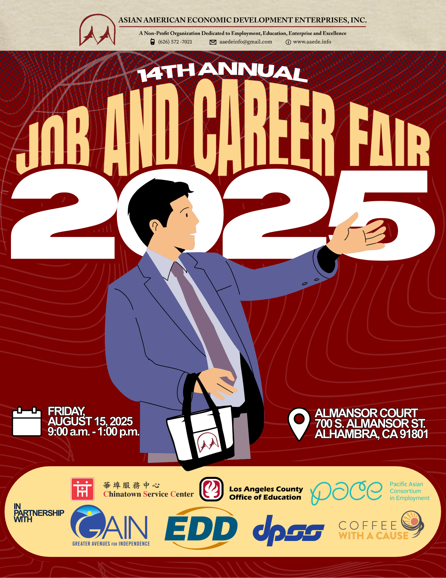 Since 1977, Asian American Economic Development Enterprises Inc (AAEDE) has been an important and positive force in the Asian community of Monterey Park, CA, and the wider Southern California area. We are proud to be a nonprofit organization that aims to support and further the educational and professional goals of the amazing people in our community. Call now to speak with one of our friendly, knowledgeable staff members and learn about our programs and events!